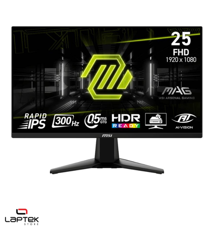 Écran Gaming MSI MAG 255XF – Taille de l’écran: 24.5″ Full HD, 300 Hz – Résolution: 1920 x 1080 pixels – Courbure: Plat – Format d’écran: 16:9 – Rapport de contraste: 1000:1 – Luminosité: 250 cd/m² – Temps de réponse: 0.5 ms (GtG, min.) – Type de dalle: Fast IPS – Angle de vue (H / V): 178°/178° – Inclinaison: -5° ~ 20° – Montage VESA: 100 x 100 mm – Technologie AMD FreeSync™ Premium – Connecteurs: 2x HDMI™ 2.0b, 1x DisplayPort 1.4a, 1x sortie casque – Couleur: Noir